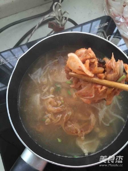 3. 我用的是骨头和豆芽熬到汤做锅底,加入2勺淘米水,放入泡菜煮20分钟左右,更入味。