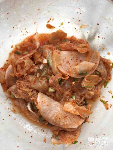 泡菜鱼片的做法 1. 因为临时起意做这道菜,就直接买了韩国泡菜回家,然后加了几片白萝卜和2棵葱腌制备用。
