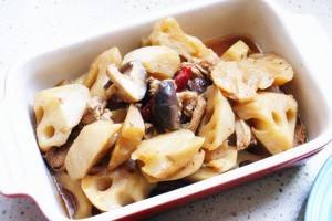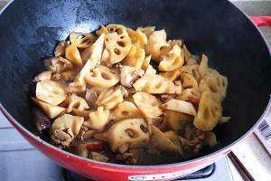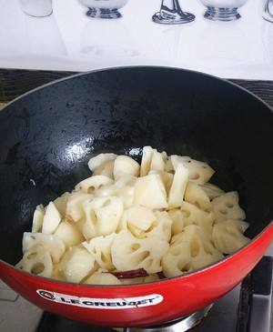 锅里放油开中火加热,放干辣椒、莲藕翻炒