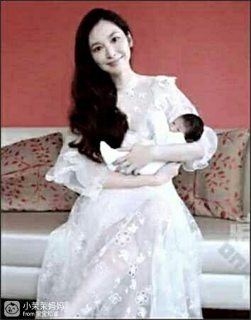 她穿上价值3万多元的Chloe 2017秋装拍照,白色雪纺长裙,露出修长美腿,如同仙女一般抱着小婴儿。