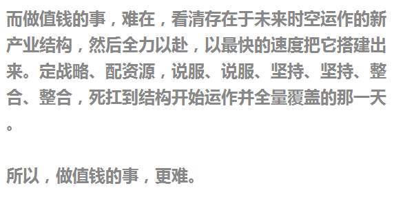 而值钱的事的核心,是结构性价值,它的兑现时间在某个未来。如同,比尔的供水系统,在拧开水龙头,清水流出之前,他所面对的,是日复一日的现金消耗,以及所有人对他的无尽质疑——我们到底能不能完成这件事,接通水,赚到钱?