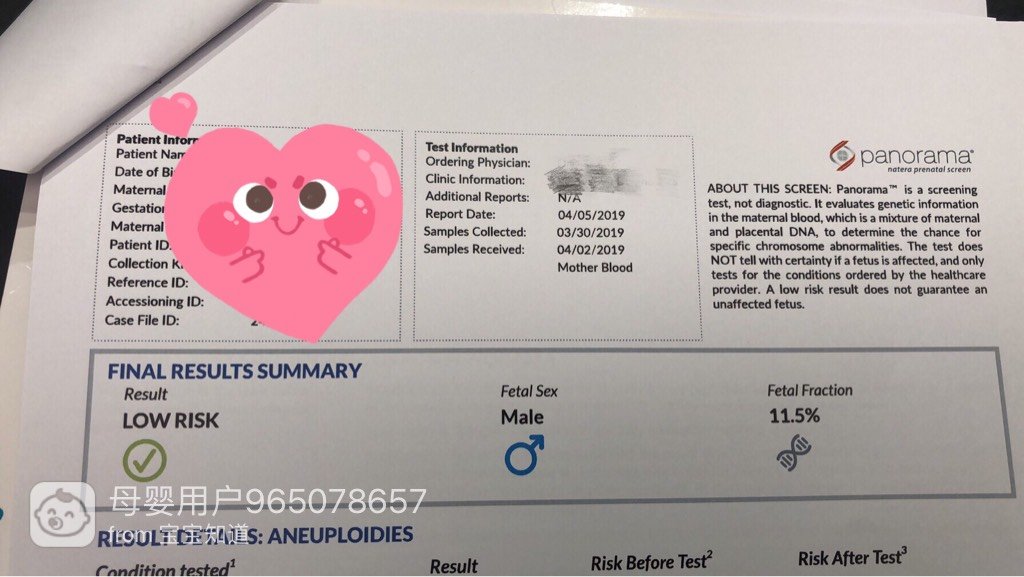 孕十周的时候抽血做了Panorama,一个目前最先进的胎儿dna唐筛检测,可以准确分离母体dna和胎儿dna从而降低误差,同时可以知晓胎儿性别。