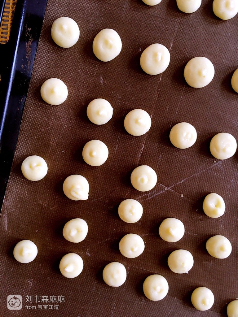 打发好的蛋黄糊装入裱花袋中,烤盘铺上油纸,挤出山药豆训蒸,记得留有一定的间距哦!