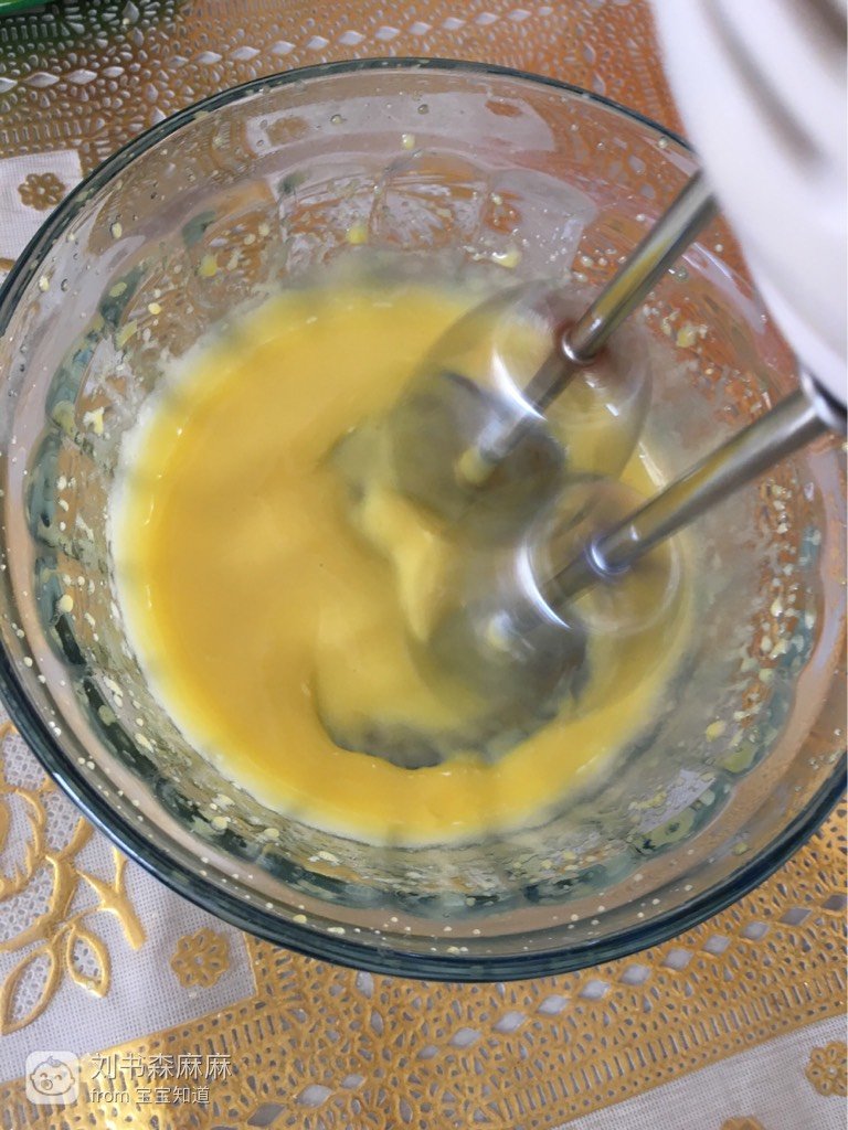 蛋清蛋黄分离,打蛋器中高速打发,打发好的蛋黄呈浅黄色,提起打蛋器,蛋黄糊不易消失即可,这个需要耐心哦;