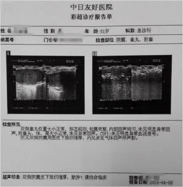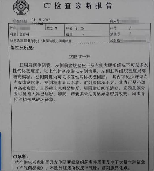 10余天前患者出现导朗肛周乔暖急肿痛不适,伴发热,无破溃流脓,于当地医院静脉点滴药物(具体不详)治疗,症状无明显缓解。入院2天前症状突然加重,疼痛剧烈,红肿范围迅速蔓延及会阴、阴囊及部分腹壁区域,伴高热、神昏。查体:患者意识模糊,高热 39.8℃,BP 80/40mmHg,急诊血常规:WBC 31.99×109/L;肛周、会阴、阴囊及部分腹壁红肿明显,可及捻发音,基本确诊为急性坏死性筋膜炎,脓毒血症锅乡伴休克。