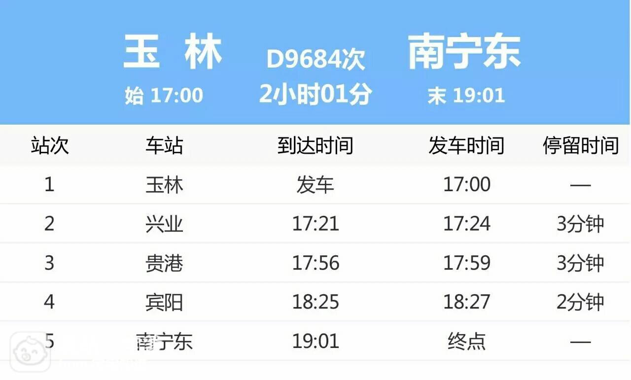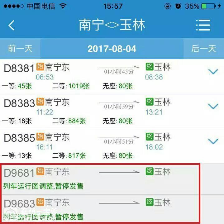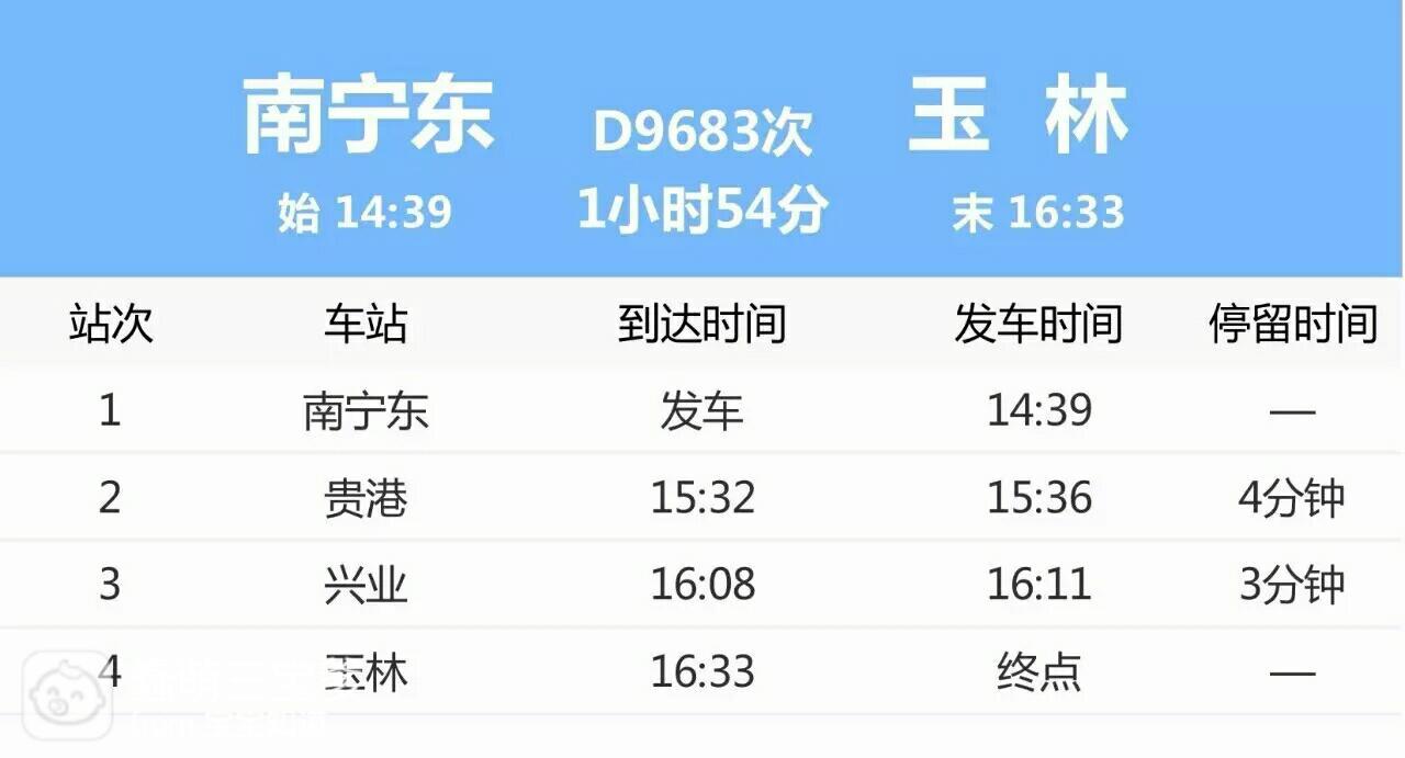 根据客流需求,南宁铁路局于2017年8月4日至8月31日始发站起,每日立灿开行南宁东~玉林菜惑D9681/2、D9683/4次临时动车组列车2对。