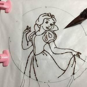 把画好在油纸上的图案反过来,有笔迹的一面朝下,开始用肿件上面融好的巧克力描出图案
