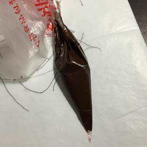 把巧克力融化,装入裱花袋,裱花袋口剪一小口