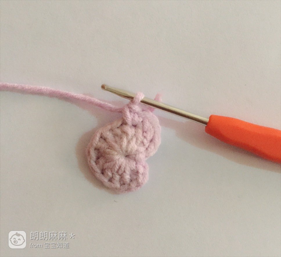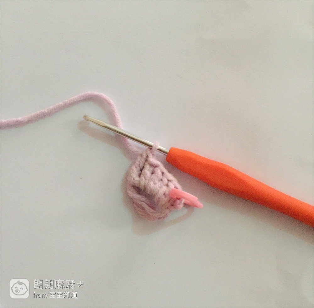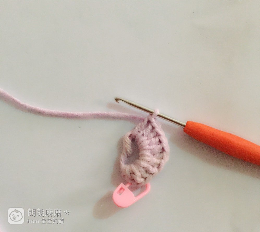 先立好三针锁针,在刚才别记号扣的地方(也就是第一针长针的辫子上)勾出两个短针,勾好后如图所示