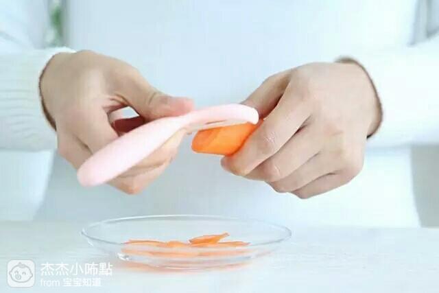 2. 胡萝卜去皮,用削皮刀削成薄片。