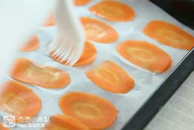 5. 烤盘里铺上硅油纸,放上胡萝卜片,刷上一点点食用油。