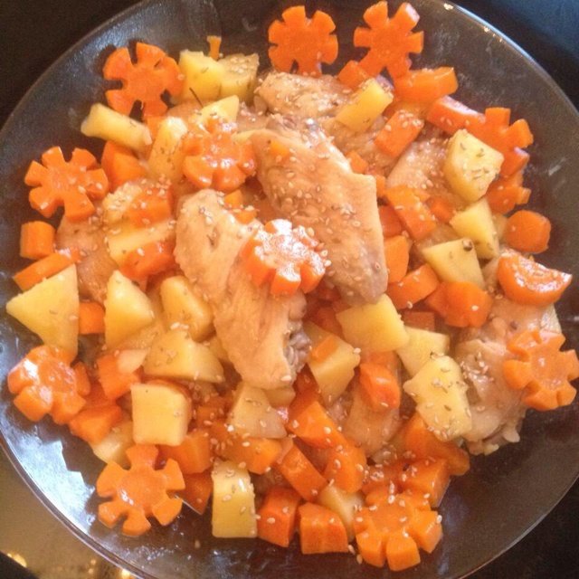 4.留点汁拌饭好香好好吃!撒点白芝麻好赞!不需要过多的调味品土豆胡萝卜的搭配就就炖出香喷喷的鸡翅。