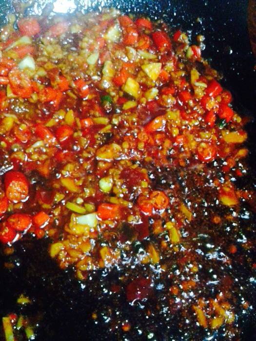 宝宝12岁22天 LV.12再次放油烧热后,放入小米椒。姜,蒜!放入半勺郫县豆瓣酱,炒出香味,豆瓣酱炒出红油