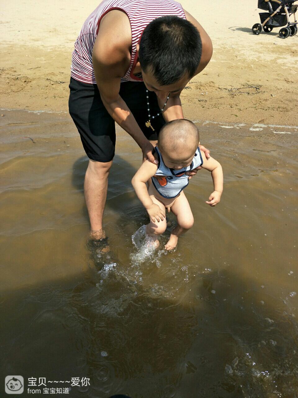看着姐姐玩的这么嗨!小家伙也着急了,一个劲的用手指向海面,嘴里也不知道说些什么,我感觉他是再说:我也要下去玩,没办法我撑着伞,宝爸抱着他也下水玩了起来,这家伙见水就笑,小脚丫还一个劲的踢向水面,溅出小水花,要不是拖住他还想坐到水里去了。