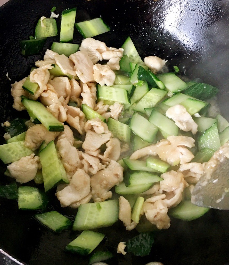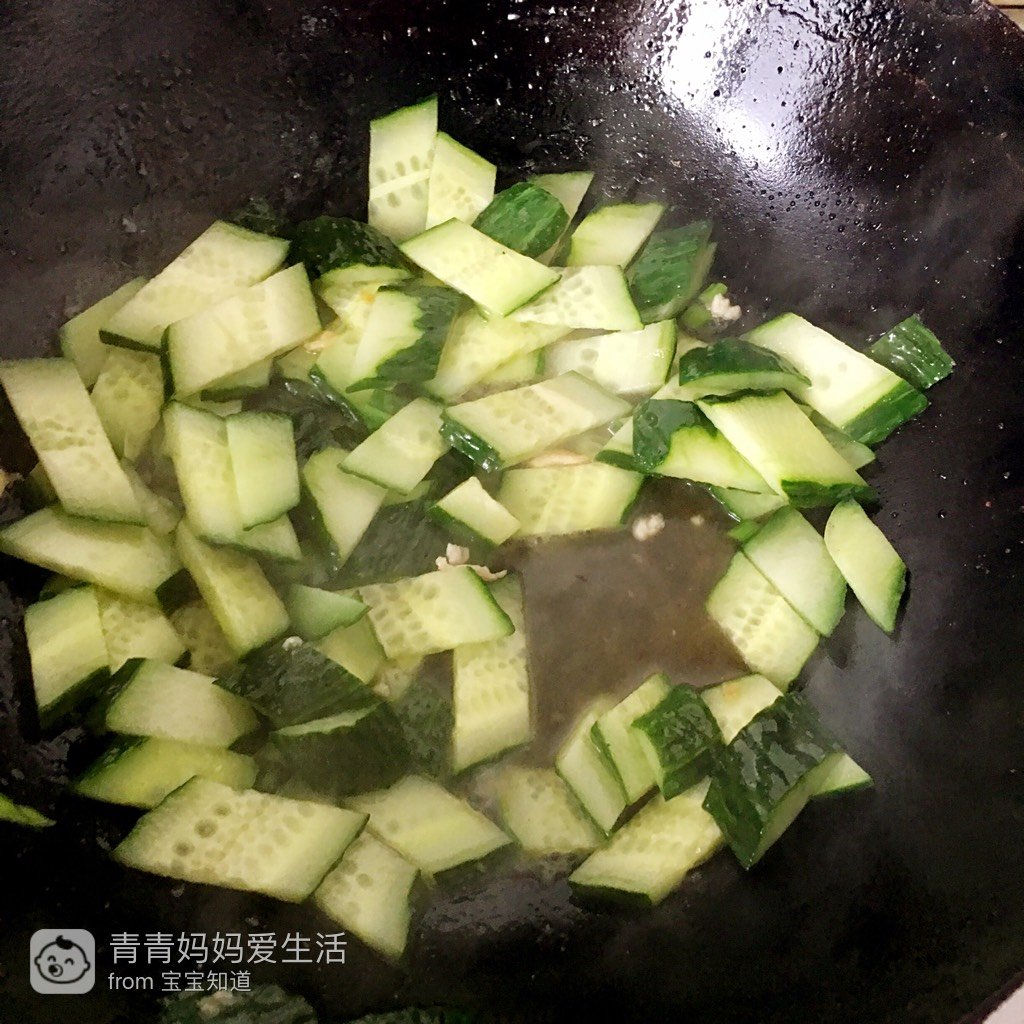 锅刷洗干净令放入油烧热,放入从姜末爆香,然后放入黄瓜片翻炒。