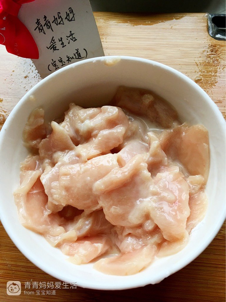 鸡胸肉片放入淀粉、一点点料酒、一点点盐抓匀。