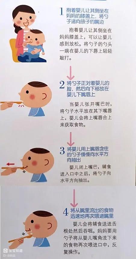让宝宝 坐妈妈腿上或婴儿餐椅泳剩,并把盛好米粉的 勺子递向宝宝的嘴边;