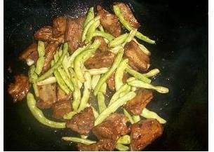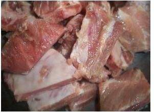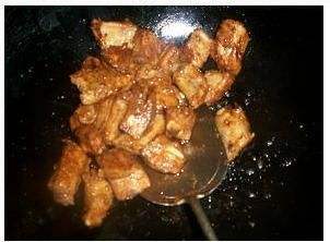 4. 锅内倒油后排骨放入快炒.倒索套入老抽上色,