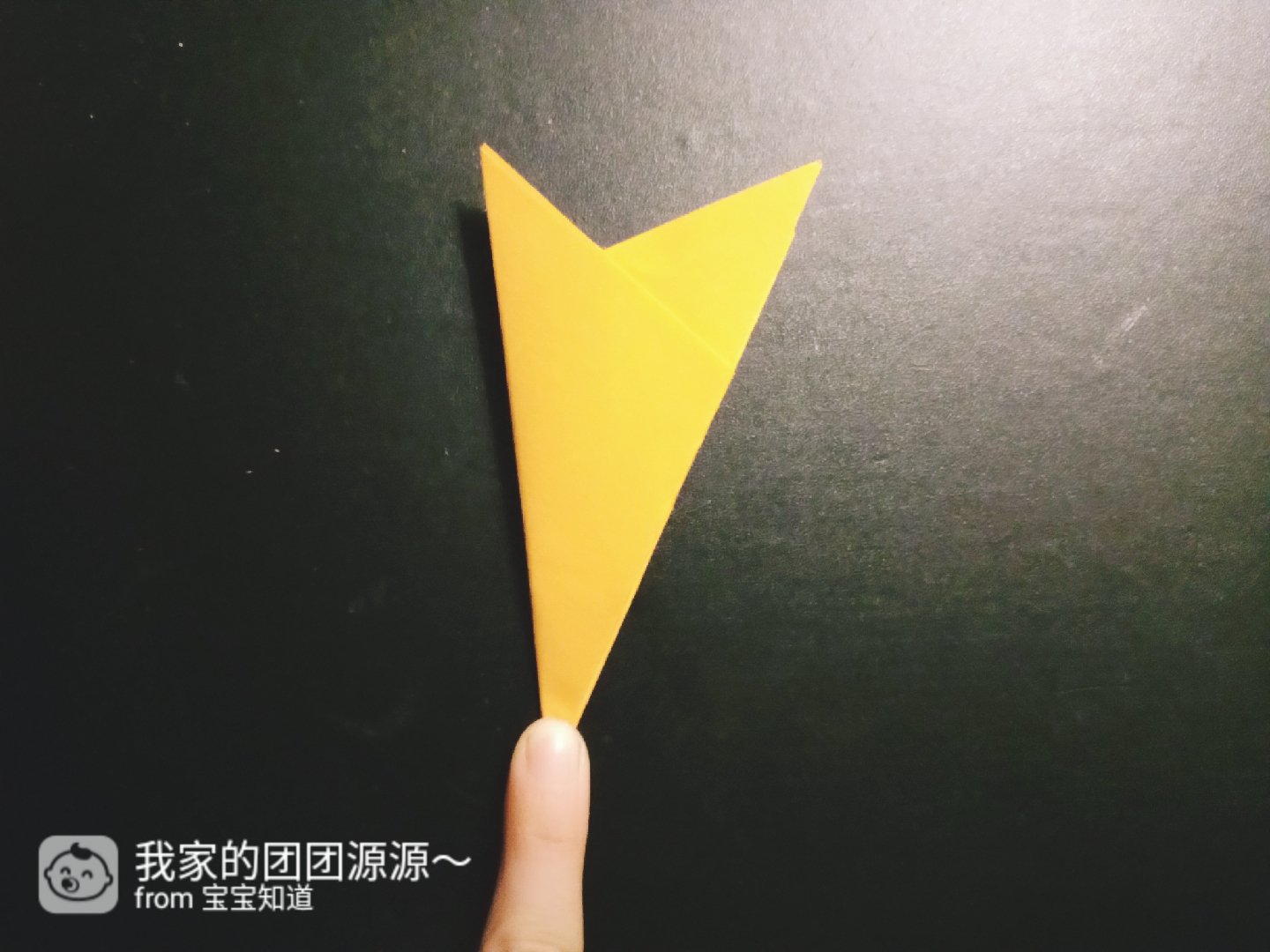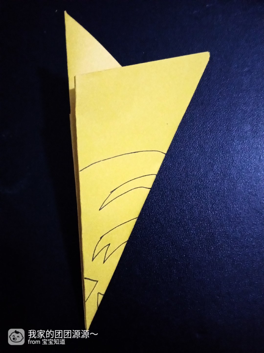 1.拿出一张黄色正方形折纸,然后对折出一个三角形。继续再对折一次,还是三角形。左右两边根据折痕交叉折叠。继续对折一次。如图二所示。