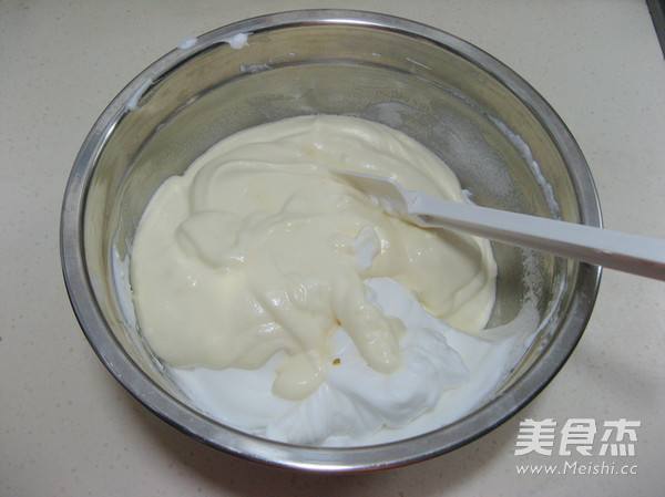 7. 取三分之一的蛋白糊入蛋黄糊中,翻拌均匀