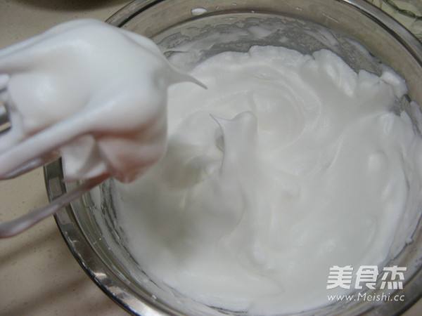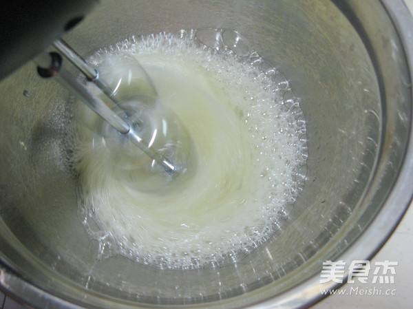 5. 用电动打蛋器将蛋白打出粗泡,50克白糖分三次倒入,白糖分别在打出粗泡、打出细腻泡沫、打出明显纹路时