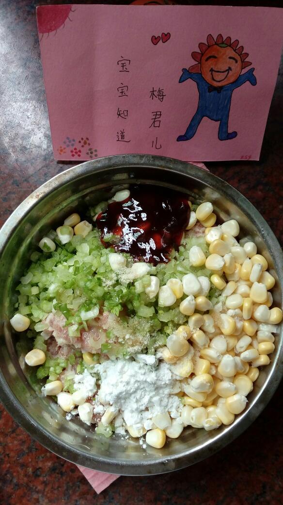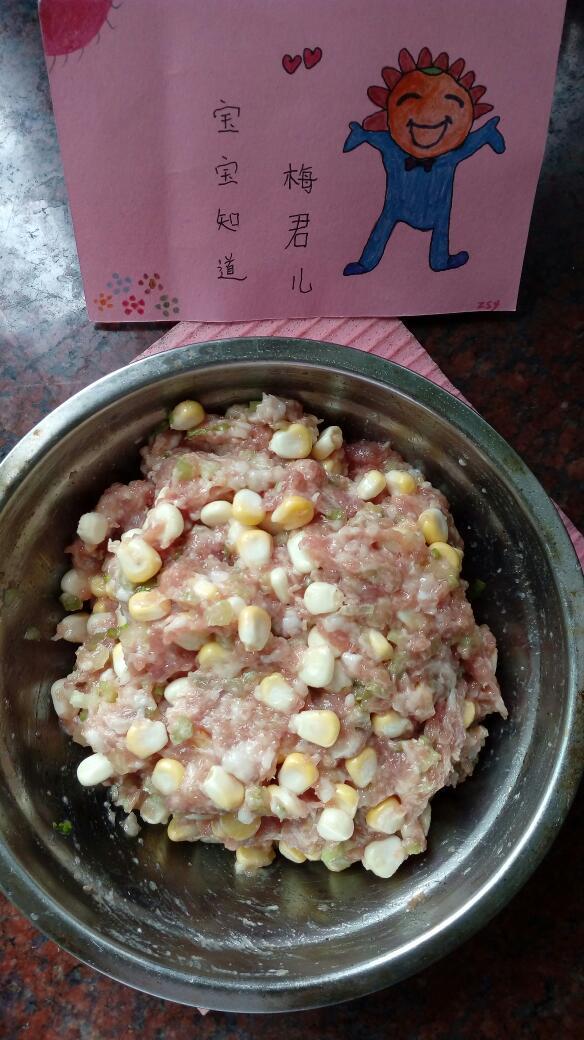 4)把玉米粒和己切碎的香芹一起倒入装猪肉泥的碗里,再加入所有的调料,搅拌均匀,搅成饺子馅。