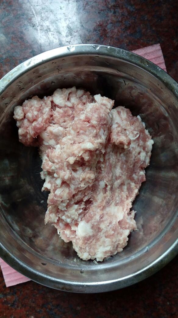 1)🐷猪肉洗干净,甩干水切成小块,剁细,反复剁,剁成猪肉泥,拿个干净没水份的大碗把剁好的肉泥放进碗里备用。