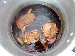 煮好后高压锅不动,焖一个小时,开锅笼菜,牛肉酱好后拿出来,连汤放进饭盒里,放进冰箱里一夜;吃的时候切片,可以沾着生抽、蒜做的汁吃。