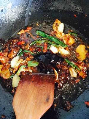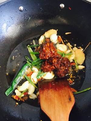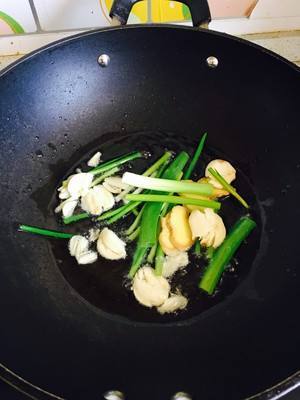 热油放葱、姜、蒜爆香,一定要多放葱和蒜,这样才好吃