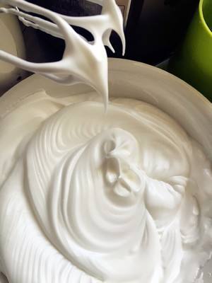 蛋白霜:用电子打蛋器将蛋白打发到鱼眼状时,加入三分之一的糖,低速打发到泡沫细腻,再加入一半糖,再次打发到蛋白纹路清晰时加入最后的糖,此时某套中高速打发到中性发泡状态,即提起是长又直的勾,不晃