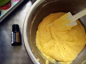 筛入低粉,用硅胶刮刀切拌和翻拌到看不见面粉的程度。最后滴入野橘精油,再次快速搅拌。注意不要过度搅拌