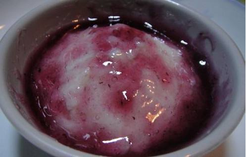 第四步:我舀了3勺蓝莓,加了一勺开水,山药泥放入碗中,用勺子稍微整一下形状淋上果酱即可。