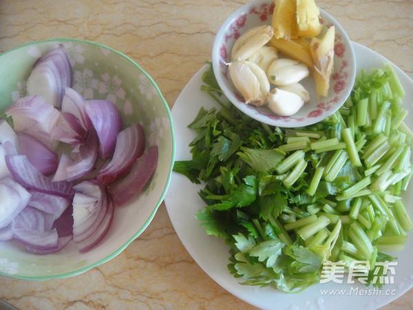 3. 香芹洗净后切碎,洋葱洗净切碎,蒜头拍碎,生姜切片