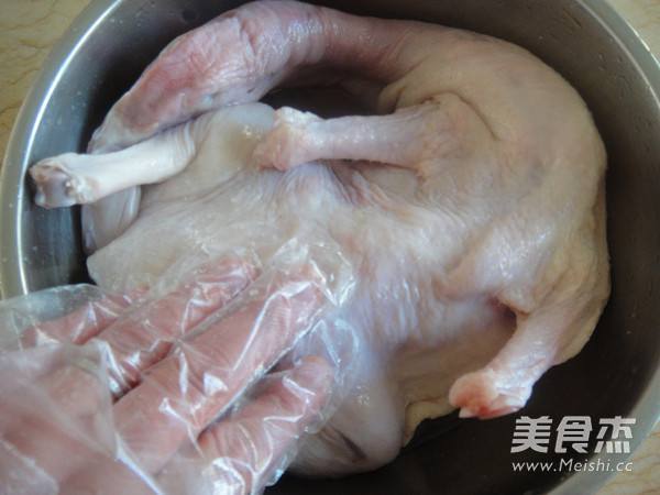 7. 全部倒入鸭子身上腌制过夜,夏天要进冰箱冷藏