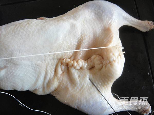 9. 腌制好的鸭子截耻用流动水冲洗干净,擦干水分后,把一勺白糖和2勺蚝油加入鸭肚子内