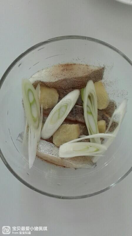 碟鱼洗净,放盐,胡椒粉,料酒,姜片,葱,腌制十五分钟