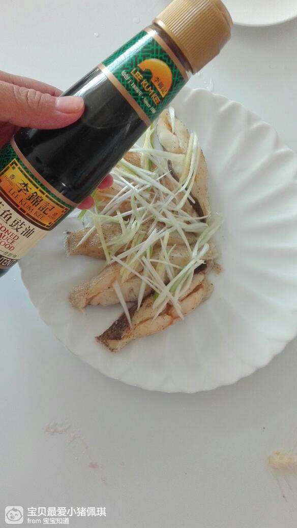 蒸好的鱼把之前的葱姜去掉重新放上葱丝姜丝,淋上蒸鱼豉油