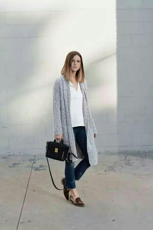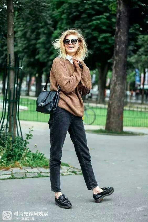 随性挤坐神的套头针织衫加一双乐福鞋,穿出简约大方。