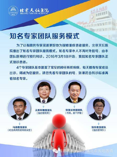 自2016年3月1日,北京天坛医院推出知名专家团队服务模式,知名专眨垃碗家本人不再对外挂号。由本团队医师进行预约转诊。