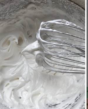 蛋白分次加糖打至湿性发泡,提起蛋头,有个弯钩轻甩就掉。