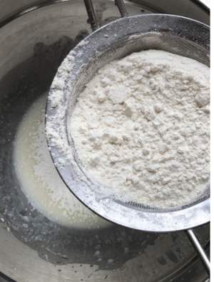 用料 undefined 鸡蛋的蛋黄蛋清分开,蛋清盆子无水无油,牛奶和油和香草精混合搅拌均匀,筛入面粉,搅拌均匀