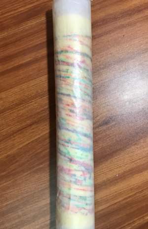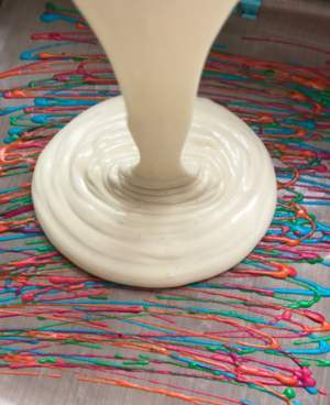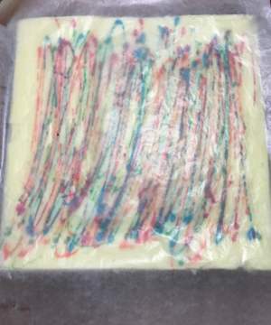 28*28cm的金盘铺好油纸或者油布或者硅胶垫,随意画线,画完第一个颜色,送烤箱烤30秒,取出