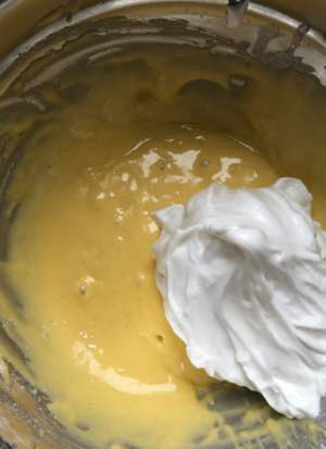取三分之一蛋白加入蛋黄,切拌均匀