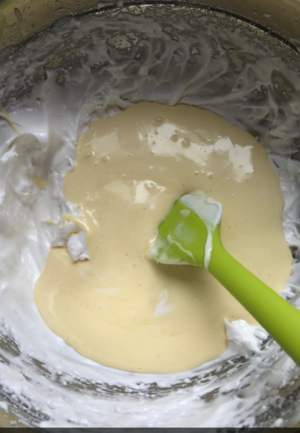 再倒回蛋白盆中,切拌搅匀,烤箱预热170度