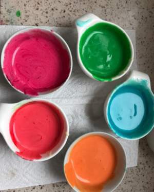 准备小碗,每个碗15克面糊,加少许色粉搅匀,装入裱花袋,裱花袋剪个特别细小的口。