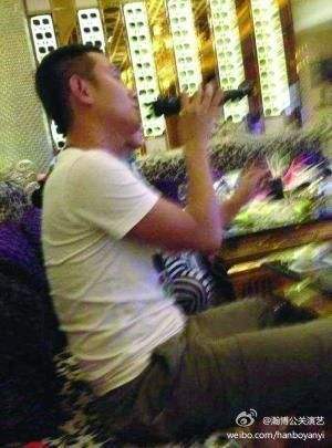 从照片中看出,身穿白色T恤、戴着棒球帽的文章手拿麦克风,唱歌如醉如痴,包房内还有年轻女孩亲密地搂着他的肩膀,照片还显示出文章明显喝高了,紧紧搂住一个女孩,身体摇摇晃晃。