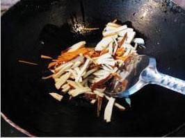 热锅下油,放入熏干和胡萝卜翻炒一会。