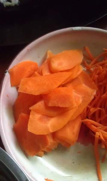 香菇瘦肉炒贡菜的做法 1. 胡萝卜切片备用