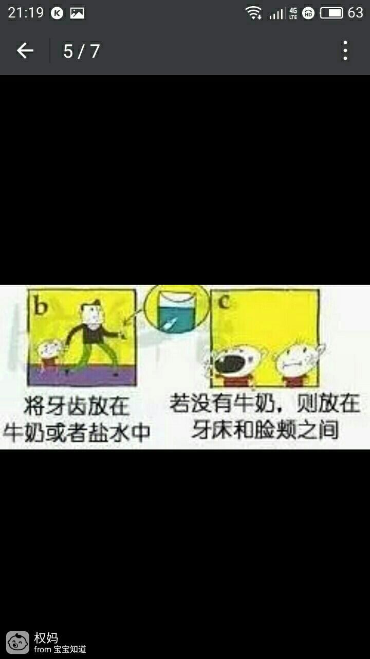 乳牙和恒牙脱落后的第一步都是要找到脱落的牙齿,拿着牙齿的牙冠部分,用牛奶或自来水冲洗后保存在牛奶中。如果找不到牛奶,可以把牙齿放在牙床和脸颊之间。