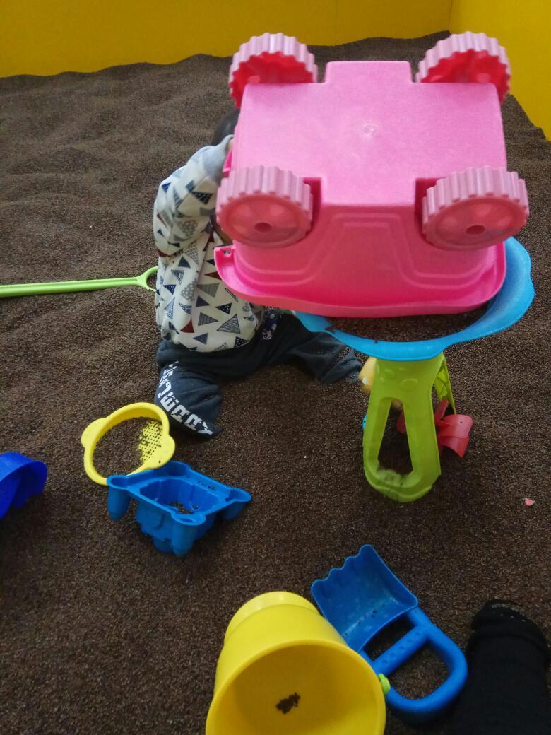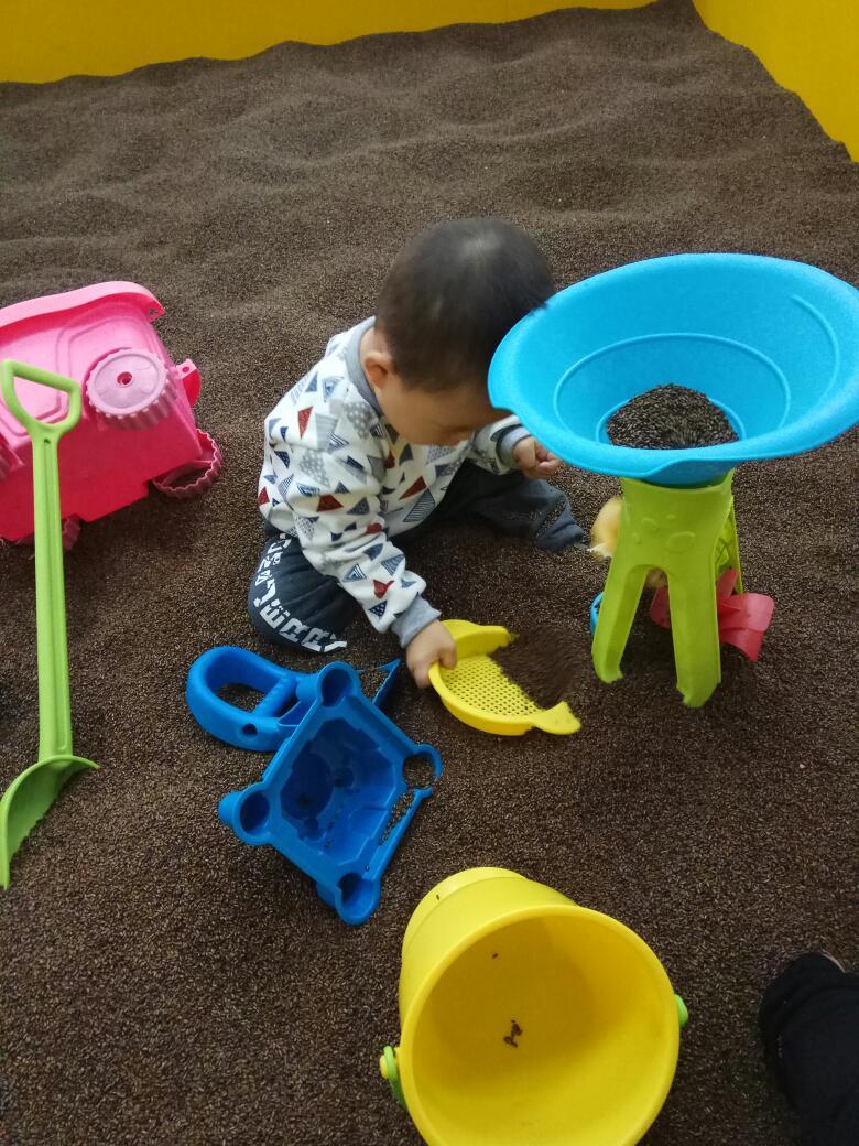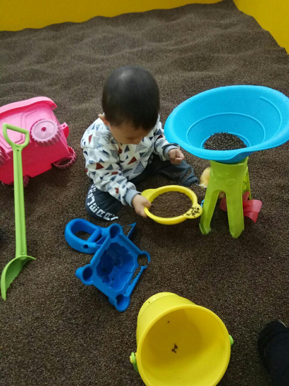 从他刚开始会走路的时候,就喜欢回老妈家里玩沙子,拿着个们瓦助小铲子左翻翻右翻翻,搞得一地的沙子。现在爱好依然不变,还是很喜欢玩沙子。游乐场里的沙子不是平日里的那种普通沙子,是用的决明子,它颗粒比较大,不会那么容易扬起来,迷了宝宝的眼睛,减少危害性。踩在上边不似普通沙子的柔软,它踩上去稍稍有点硬,还有点凉凉的。